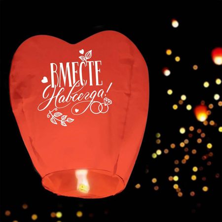Небесный фонарик «Вместе навсегда», сердце, красный. Объемная конструкция сделана из бумаги, пропитанной антигорючей смесью. В нижней части купола на проволоке закреплена свеча-горелка. Она разогревает воздух внутри фонарика, поднимает его вверх и эффектно подсвечивает изнутри. Длительность полета составляет около 20 минут — за это время бумажный фонарик поднимается на высоту до 200 метров. С помощью небесного фонарика вы сможете ярко завершить значимое событие в жизни, любое мероприятие станет запоминающимся с таким праздничным атрибутом.