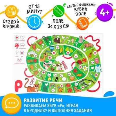 Автоматизируем звук [Р] в игровой формеПеред вами не просто весёлая игра-бродилка. Это полезное пособие, которое поможет автоматизировать и закрепить произношение звука [Р] в начале, середине и конце слова. Маленьким участникам предстоит передвигаться по игровому полю и выполнять разные задания.Как играть?Разверните поле и поместите его в центр стола, чтобы все могли дотянуться. Вырежьте фишки и раздайте каждому по одной. Положите их на клетку «Старт» на поле. Для игры понадобится кубик (в комплект входит развёртка). Задача участников: быстрее остальных добраться до финиша.Игроки по очереди бросают кубик и передвигают свою фишку на выпавшее число клеток. На поле есть специальные обозначения, их нужно учитывать и выполнять задания. Например, назвать, какое количество предметов нарисовано на поле. Или назвать цвет предмета, его размер, и так далее.Затем ход переходит к следующему игроку по часовой стрелке. Побеждает тот, кто первым доберётся до клетки «Финиш».Внутри вы найдёте:бродилку,карточку с фишками,развёртку кубика.Играйте и развивайтесь вместе с ЛАС ИГРАС!