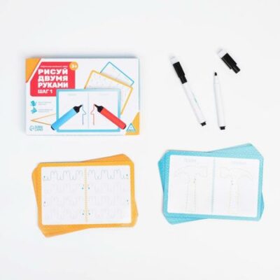 Нейропсихологический набор пиши-стирай «Рисуй двумя руками. Шаг 1», 20 карт, 3+. <b> Учимся рисовать двумя руками. Шаг 1</b> Внутри вас ждет 20 двухсторонних карточек, в которых нужно рисовать обеими руками сразу. В этом вам помогут маркеры в наборе. На одной стороне карт находятся простые изображения, а на другой — прописные элементы. Это поможет синхронизировать работу обоих полушарий мозга. Все карточки многоразовые. Стереть рисунок можно с помощью сухой салфетки или обратной стороной маркера. <b> Польза игры</b> <ul> <li> Развивает оба полушария мозга.</li> <li> Тренирует моторику рук.</li> <li> Готовит руки к письму.</li> </ul> <b> Внутри вы найдете</b> <ul> <li> 20 двухсторонних карт.</li> <li> 2 маркера.</li> </ul> <b> Развиваем оба полушария одновременно!</b>