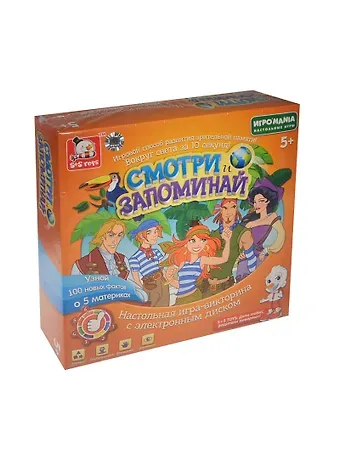 Настольная игра «Смотри-Запоминай»: В комплекте игровое поле, 5 фигурок персонажей, песочные часы, электронный диск, 100 карточек, 5 пазл-дощечек, 25 призовых фигурок. Каждый игрок выбирает себе фигурку персонажа и пазл-дощечку, игроки ставят фигурки персонажей на стол, право первого хода определяется большим количеством очков после нажатия на электронный диск. Начинающий игрок выбирает любую категорию и берет карточку из соответствующей колоды, переворачивает песочные часы, и внимательно изучает картинку в течении определенного времени, по истечении времени игрок переворачивает карточку и отвечает на вопросы на ее обратной стороне, другой игрок определяет правильность ответа по картинке, при достижении клетки 15 начинается этап игры без электронного диска, дальше передвижение зависит от интелекта игрока. Как только игрок собрал все фигурки на пазл дощечке, то он может двигаться к центру круга и стать Победителем!!!