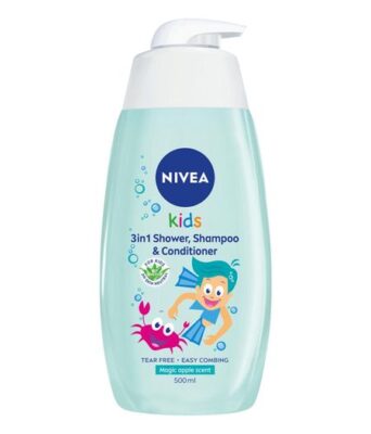 NIVEA KIDS 3-in-1 Shower Gel — Shampoo and Conditioner — Gentle care for little ones with an enchanting apple scent. NIVEA Kids 3-in-1 shower gel cleanses childrens sensitive skin and hair. The moisturizing and nourishing formula with organic aloe vera and chamomile is without soap, alcohol, mineral oils and aluminum. For this, it is easily biodegradable and therefore does something good not only for the skin, but also for the environment. NIVEA KIDS 3-in-1 Shower Gel, Shampoo Conditioner — Extra Soft Childrens Skin Care formula with Bio Aloe Vera gently cleanses and cares for kids delicate skin and hair. Soft cream formula with Bio Aloe Vera Chamomile protects from tears ensures easy hair combing. With soap free formula, skin-friendly pH and tested by pediatricians dermatologists.