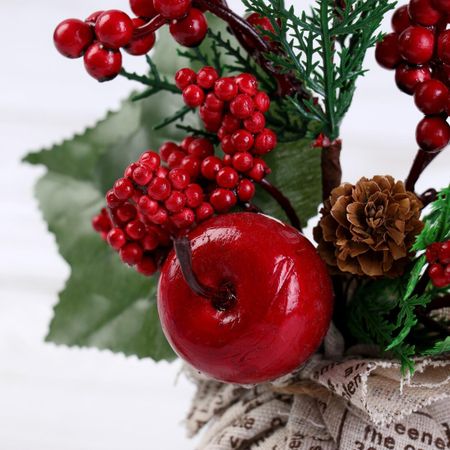 Новогодняя композиция на стол «Зимнее волшебство. Очарование», в мешочке, 17 см. Эта новогодняя композиция на стол выполнена в красном цвете и размещена в мешочке. Ее высота составляет 17 см, что делает ее идеальным украшением для праздничного стола, новогодней сервировки и зимних декораций. Использование дерева, пластика и текстиля создает гармоничный образ, сочетающий стильные элементы и праздничную атмосферу. Особенности <ul> <li> Размер – 17 см, подходит для украшения праздничных столов, витрин и интерьерных композиций.</li> <li> Стиль – сочетание новогоднего барокко и скандинавского дизайна придает композиции изысканность и уют.</li> <li> Цвет – яркий красный оттенок подчеркивает праздничность и тепло зимних праздников.</li> <li> Материалы – дерево, пластик и текстиль обеспечивают прочность, реалистичность и эстетическую привлекательность.</li> <li> Тематика – Новый год, отлично подходит для создания праздничной атмосферы на столе или в интерьере.</li> </ul> Преимущества использования <ul> <li> Легко сочетается с другими новогодними украшениями: свечами, гирляндами или декоративными элементами.</li> <li> Обладает универсальностью: подходит для различных стилей оформления – от классики до современного шика.</li> <li> Долговечна благодаря качественным материалам, сохраняет привлекательный вид на протяжении всего сезона.</li> </ul> Эта композиция станет центром внимания на праздничном столе, создавая атмосферу зимнего волшебства и очарования. Ее можно использовать как самостоятельный декоративный элемент или в сочетании с другими украшениями для оформления новогоднего интерьера. Простая в использовании и аккуратная по исполнению, она поможет сделать ваш праздник особенным и запоминающимся.