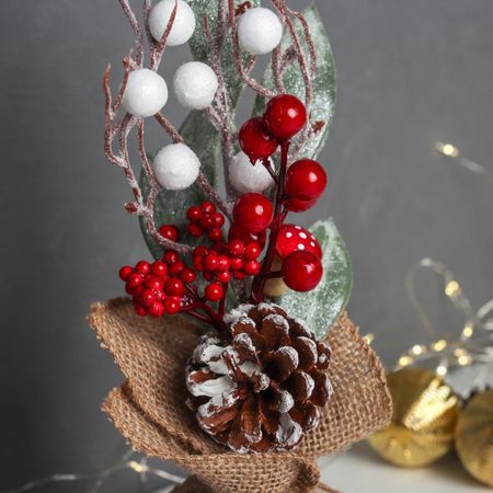Новогодняя композиция на стол «Зимнее волшебство. Яркий праздник», в мешочке, 25×10 см. Новогодняя композиция в мешочке с коричневыми и красными элементами станет оригинальным украшением праздничного стола. Размер 25×10 см позволяет создавать уютные зимние декорации, которые подчеркнут атмосферу Нового года и зимних праздников. Такой аксессуар легко впишется в любой интерьер, добавляя тепла и праздничного настроения. Особенности <ul> <li> Размер – 25×10 см, подходит для центральных украшений на столе и зимних композиций.</li> <li> Цвет – сочетание коричневого и красного создает теплую и праздничную палитру.</li> <li> Материалы – пластик, дерево и текстиль обеспечивают прочность и реалистичный внешний вид.</li> <li> Стиль – гармоничное сочетание натуральных материалов с праздничной тематикой.</li> <li> Тематика – Новый год, зимняя сказка, создающая атмосферу уюта и волшебства.</li> </ul> Преимущества использования <ul> <li> Эффективно дополняет новогодний декор, делая стол более привлекательным и праздничным.</li> <li> Легко сочетается с гирляндами, свечами, снежинками и другими зимними украшениями.</li> <li> Многофункциональна: подходит для оформления центральных элементов стола или создания зимних композиций в интерьере.</li> </ul> Эта композиция станет изюминкой вашего новогоднего праздника. Ее стильный дизайн в теплых коричнево-красных тонах создаст атмосферу уюта и волшебства. Простая в использовании и долговечная, она поможет оформить праздник так, чтобы он запомнился всей семье и гостям как особенное событие.