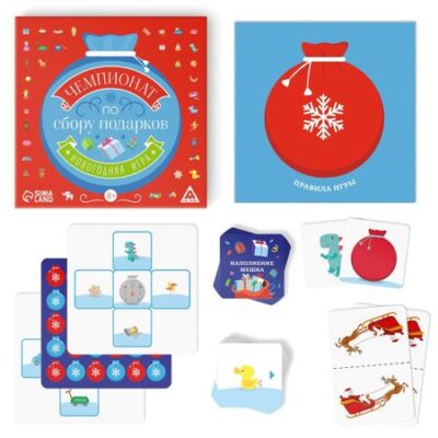 Новогодняя настольная игра «Новый год: Чемпионат по сбору подарков», 96 карт, 8+. <b> Станьте участником Чемпионата по сбору подарков</b> Вы — рождественские эльфы, которые принимают участие в Чемпионате мира по сбору подарков. У каждого будет напарник, вместе с которым вам предстоит справляться со всеми заданиями. В этой игре вы сможете потренироваться в скорости, внимательности и ловкости. Самое главное — хорошо сработаться с напарником, действовать быстро и слаженно, чтобы опередить по очкам другие команды. Удачи, эльфы! <b> Как играть?</b> Сначала разделитесь на команды, в каждой команде должно быть 2 человека. Вся игра состоит из 4 раундов: «Ищем подарки на скорость», «Подарки в мешке», «Запрягаем оленей в сани» и «Главный экзамен». В каждом раунде вам с напарником нужно выполнять задания на скорость, чтобы получить заветные очки. Чем больше очков, тем ближе вы к победе в Чемпионате по сбору подарков. Участникам предстоит искать мешки с подарками и наполнять их, на скорость выбирать подходящие мешки для подарков, хлопать по карточкам, подкидывать карточки так, чтобы они встали в нужное положение, и делать многое другое. Самое главное — научиться достигать результата вместе с напарником, стать одним целым. Ведь только так можно победить! После того, как каждая команда поучаствовала в экзамене, раунд завершается. Подведите итоги экзамена: подсчитайте, сколько очков за всю игру удалось набрать командам. Команда, которая набрала очков больше всех, победила! <b> Внутри вы найдете:</b> <ul> <li> 20 карт «Мешок с подарками»,</li> <li> 20 карт «Наполнение мешка с подарками»,</li> <li> 20 карт «Мешок»,</li> <li> 40 карт «Подарки»,</li> <li> 10 карт «Оленья упряжка»,</li> <li> 6 карт оленей,</li> <li> правила игры.</li> </ul> <b> Встречайте Новый год вместе с ЛАС ИГРАС!</b>