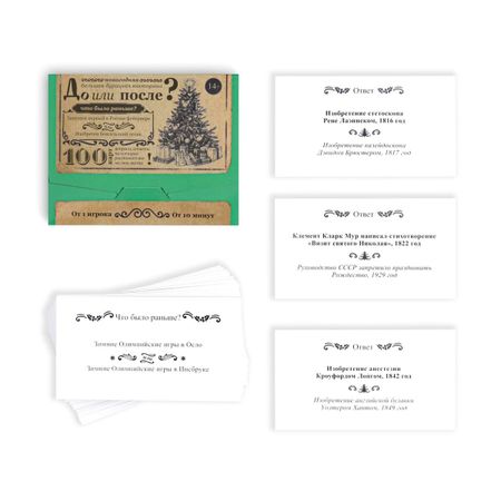 Новогодняя настольная игра «Новый год: Большая дурацкая викторина. До или после», 100 карт, 14+. <b> Вопросы, ответы на которые расставят все на свои места</b> Встречайте продолжение легендарной викторины в новом формате. Здесь вас ждут вопросы, связанные с Новым годом и не только. На одной стороне карточки написан вопрос и два варианта ответа. Ваша задача — определить, какое из двух событий было раньше. Чтобы проверить себя или другого участника, просто переверните карту. Там находится ответ и небольшая пояснительная информация. <b> Состав</b> : 100 карт. <b> Встречайте Новый год вместе с ЛАС ИГРАС!</b>