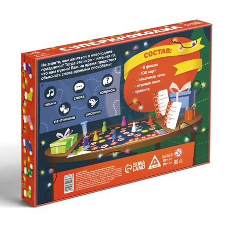 Новогодняя настольная игра «Новый год: Супер крокодил», 100 карт, 10+. Не знаете, чем заняться в новогодние праздники? Тогда эта игра — именно то, что вам нужно! Вам на время предстоит объяснять слова разными способами: <ul> <li> слова</li> <li> вопросы</li> <li> рисунки</li> <li> пантомима</li> <li> песни</li> </ul> Состав: <ul> <li> 6 фишек</li> <li> 100 карт</li> <li> песочные часы</li> <li> игровое поле</li> <li> правила игры</li> </ul>