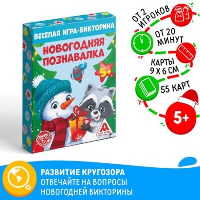 Игра-викторина для всей семьиЭта игра поможет весело встретить самый волшебный праздник, а ещё узнать много нового и интересного. Внутри вас ждёт 3 вида заданий: вопросы зимней викторины, объяснение предметов с помощью мимики и жестов, а также задачки на поиск букв и составление слов. Играйте и развивайте кругозор, логику, смекалку и артистические навыки!Как играть?По очереди выбирайте, из какой колоды вы будете вытягивать карточки.В карточках «Отгадай, что это?» вас ждёт вопрос и варианты ответа. Ваша задача — вслух зачитать вопрос и ответить на него.Если участник дал правильный ответ, то он забирает карточку себе.Если игрок ошибся, карточка отправляется в отдельную колоду сброса.В карточках «Объясни жестами» написано слово или словосочетание, которое нужно объяснить с помощью мимики и жестов. При этом нельзя указывать на предметы, писать или рисовать в воздухе.Если остальные участники отгадали, игрок забирает эту карточку себе и откладывает рядом с собой до подсчёта в конце игры.Если участники не смогли догадаться, то игрок зачитывает правильный ответ, а карта уходит в сброс.В карточках «Найди и собери» задача участника — найти на карточке все спрятанные буквы, выписать их на листок и собрать из них слово. Собранное слово нужно обязательно озвучить всем игрокам!Если участник дал правильный ответ, он забирает эту карточку себе и откладывает рядом с собой до подсчёта в конце игры.Если игрок ошибся, карточка отправляется в отдельную колоду сброса.Играйте до тех пор, пока во всех колодах не закончатся карточки. После этого каждый участник подсчитывает карточки, собранные в течение игры. Победит тот, у кого их больше всех!Внутри вы найдёте55 карт.Правила игры.Встречайте Новый год вместе с ЛАС ИГРАС!