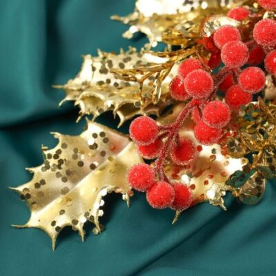 Новогодняя ветка декоративная «Зимнее волшебство. Грация», пластик, ягодки, листочки, 30×12 см, красно-золотой. Декоративная ветка «Грация» — это яркий и благородный акцент для новогоднего убранства. Изделие размером 30х12 см выполнено из пластика и оформлено в виде веточки с ягодками и листьями. Украшение в красно-золотой гамме создано в стиле новогоднего барокко — решение для тех, кто ценит свет, форму и зимнюю атмосферу без лишней вычесленности. <b> Особенности</b> <ul> <li> Тематика — Новый год, где каждый элемент работает на общий образ праздника и семейного тепла.</li> <li> Цвет — красный с золотистыми акцентами, сочетание, напоминающее добрые традиции и создающее ощущение торжества.</li> <li> Материал — прочный пластик, подходящий для многократного использования и безопасный в бытовом применении.</li> <li> Форма — веточка с ягодками и листочками, добавляющая декору символики и мягкой динамики.</li> <li> Стиль — новогоднее барокко, богатство форм без излишней пышности, легко сочетающееся с другими украшениями.</li> </ul> <b> Праздник начинается с одного мягкого взгляда на елку</b> Эта ветка делает дерево частью вашей личной зимней истории. Красно-золотые тона и ритм формы работают вместе, чтобы передать атмосферу семейного тепла и предпраздничного ожидания. Используйте ее как самостоятельный элемент или фоновое дополнение — одинаково хорошо усиливает дух торжества и доброжелательность дома.
