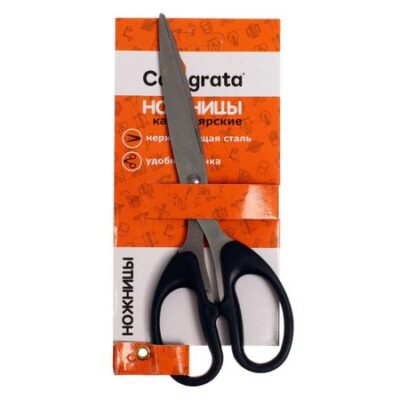 Ножницы канцелярские 19 см, ручки пластиковые, черные. <ul> <b> Ножницы для работы бумагой и картоном.</b> </ul> <li> Изготовлены из нержавеющей стали.</li> <li> Имеют острые лезвия, что снижает нагрузку на руку.</li> <li> Благодаря продуманной форме ручек они удобны как для рукоделия, так и для творчества.</li> <li> Незаменимые универсальные ножницы для офиса и для дома.</li> <b> Внимание! Могут встречаться заломы на подложке, при сгибании плотного картона с нанесением, такие заломы неизбежность транспортировки</b>
