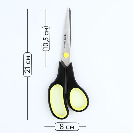 Ножницы канцелярские 21 см, PROвыбор «Черный неон». Ножницы канцелярские торговой марки PRO Выбор предназначены для работы с бумагой и картоном . Имеют мягкие вставки на ручках, благодаря которым ножницы не будут скользить в руке. Преимущества: • Острые и прочные лезвия; • Нержавеющая сталь; • Удобная ручка; • Двухсторонняя заточка. <ul> <li> Длина, см: 21;</li> <li> Ширина, см: 8;</li> <li> Европодвес: да.</li> <li> Срок годности: не ограничен;</li> <li> Состав: металл, пластик.</li> </ul>