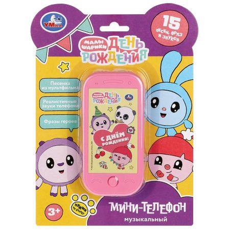 Обучающая игрушка Малышарики, Умка HT1458-R1-FT. Музыкальный мини-телефон «Малышарики. День рождения» ТМ «УМка» станет отличным подарком для маленьких поклонников одноименного мультфильма:<br> — 15 песен, фраз и звуков<br> — веселая песенка «День рождения»<br> — реалистичные звуки телефона<br> — фразы Малышариков<br> — оригинальный дизайн с любимыми персонажами<br> <br> Этот яркий телефон с дизайном в стилистике популярного мультика непременно понравится малышу. Он с удовольствием будет нажимать на кнопочку и слушать веселую песенку про день рождения, фразы любимых героев и забавные звуки телефона. Благодаря компактным размерам игрушку удобно повсюду брать с собой.<br> <br> Игра с музыкальным телефоном ТМ «УМка» способствует развитию:<br> — памяти<br> — слухового восприятие и музыкального слуха<br> — логического мышления<br> — тактильных навыков<br> — моторики<br> <br> Размер игрушки: 12 x 7 x 2 см. Материал: пластмасса.<br> Работает от 3-х батареек типа LR44 (в комплекте).<br> Рекомендовано детям от 3-х лет.