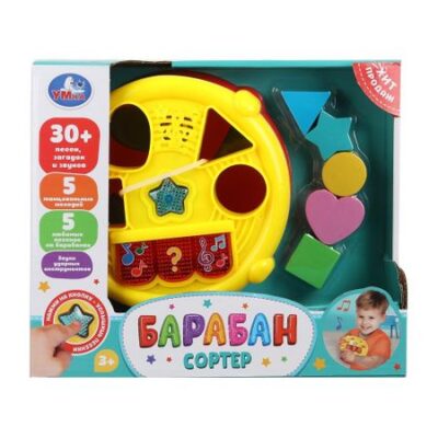 Обучающая игрушка Шаинский музыка, Умка HT1459-R. Музыкальная игрушка «Барабан-сортер» ТМ «УМка» станет прекрасным подарком для ребенка:<br> — 30+ песен, загадок и звуков<br> — 5 любимых песенок на барабанах: «Вместе весело шагать», «Улыбка», «Чунга-Чанга», «Антошка», «Когда мои друзья со мной» <br> — 5 танцевальных мелодий: «Макарена», «Самба де Жанейро», «Тудери тумба», «Собачий вальс», «Цыпленок»<br> — звуки ударных инструментов<br> — загадки<br> — объемные детали сортера<br> — световые эффекты<br> <br> Эта яркая музыкальная игрушка, выполненная в виде забавного барабана непременно понравится малышу. Играя с сортером, главной задачей ребенка будет правильно подобрать блок к соответствующему отверстию. Ребенок будет с удовольствием играть с сортером, слушая любимые песенки, веселые мелодии, а также отгадывая загадки.<br> <br> Музыкальная игрушка ТМ «УМка» способствует развитию:<br> — слухового восприятия и музыкального слуха<br> — тактильных навыков<br> — визуального восприятия<br> — логического мышления<br> — мелкой моторики<br> <br> Размер игрушки: 25 х 25 х 4 см. Материалы: пластмасса.<br> Работает от 2-х батареек типа ААА (в комплекте).<br> Рекомендовано детям от 3-х лет.