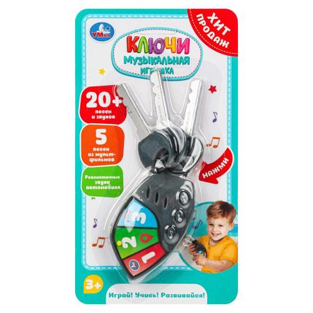 Обучающая игрушка Шаинский музыка, Умка ZY179937-R4. Музыкальная игрушка «Ключи» ТМ «УМка» непременно понравятся вашему ребенку:<br> — 20 песен и звуков<br> — 5 песен из м/ф (фрагменты): «По дороге с облаками», «Мы едем, едем, едем», «Веселая карусель», «Улыбка», «Песенка друзей» из м/ф «Бременские музыканты»<br> — реалистичные звуки автомобиля<br> — три объемных ключика<br> — оригинальный дизайн<br> <br> Малыш с удовольствием будет играть с этой оригинальной игрушкой в виде ключей, нажимать на кнопки и слушать веселые песенки и реалистичные звуки машины. Компактную игрушку удобно брать с собой на прогулку или в путешествие.<br> <br> Игра с музыкальной игрушкой ТМ «УМка» способствует развитию:<br> — слухового восприятия и музыкального слуха<br> — тактильных навыков<br> — визуального восприятия<br> — логического мышления<br> — мелкой моторики<br> <br> Размер: 7 х 14 х 2 см. Материал: пластмасса.<br> Работает от 2-х батареек типа LR44 (в комплекте).<br> Рекомендовано детям от 3-х лет.