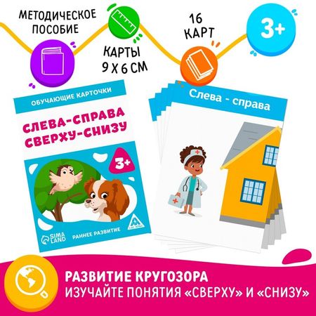 Развиваем ориентацию в пространстве у ребёнкаОбучающие карточки позволят малышу познакомиться с понятиями «лево» и «право», «верх» и «низ». С помощью карточек ребёнок разовьёт память, интеллект, зрительное и слуховое восприятие. Подавайте новый материал в игровой форме, так он быстрее и легче усваивается.Как пользоваться карточками?Объясните ребёнку, что значат слова «слева» и справа».Рассмотрите карточки «Слева–справа». Назовите, что изображено на карточке. Обсудите, что находится справа, а что слева.После того, как эта тема будет изучена, переходите к «Верх–низ».Объясните ребёнку, что означают понятия «вверху» и «внизу».Назовите, что изображено на карточке. Обсудите, что находится вверху, а что внизу.Внутри вы найдёте:16 карточек,памятку для родителей.Играйте и развивайтесь вместе с ЛАС ИГРАС!