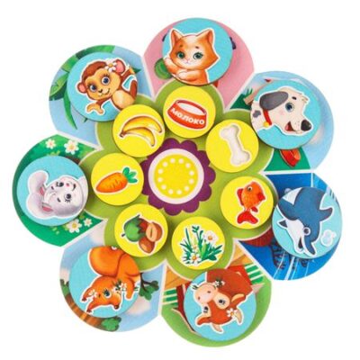 Обучающий круг с липучками «Головоломка. Кто где живет и кто что ест?». Игрушка с липучками — это идеальный вариант для подвижных малышей или для того, чтобы взять игру в поездку, детский сад. Перед началом игры освободите круг от липучек, попросите малыша назвать всех животных и элементы, обозначающие еду. Затем дайте ребенку самостоятельно прикрепить животное к месту его обитания. Когда малыш будет брать липучку с каким-то животным, спросите, что он о нем знает, где встречал/видел. Потом переходите к определению кто что есть. Пройдя всю игру, малыш запомнит кто где живет и кто что есть. Затем можете усложнить игру: путать места обитания и пищу среди животных. Задача ребенка: исправить ошибки