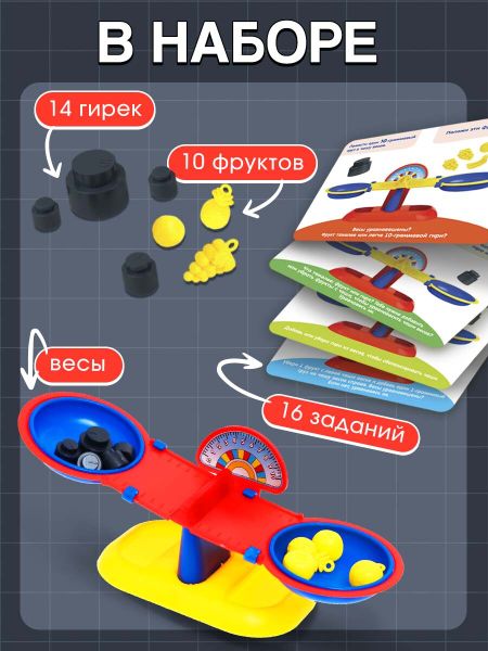 Обучающий набор «Умные весы», баланс, счет, по методике Монтессори. «Умные весы» — это набор для игры в магазин, обучения счету и подготовки к школе! У вашего малыша дома будут настоящие весы с гирьками и фруктами. Выполняя задания, он научиться считать. Каждое упражнение поможет будущему ученику познакомиться с работой весов и закрепить полученные знания. Красочные картинки с заданиями привлекают внимание малыша. Гирьки и фрукты выглядят как настоящие! Игровой набор рекомендован для детей старше 5 лет. Он научит ребенка мыслить логически, считать, сравнивать и анализировать. <b> Играйте и обучайтесь вместе с нами!</b>