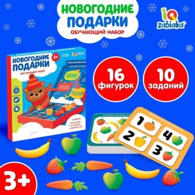 С обучающим набором «Новогодние подарки» ваш кроха встретит Дедушку Мороза и отправится вместе с ним в сказочную страну! Малыш познакомится со многими животными, обучится счёту, разгадает новогодние загадки и выполнит увлекательные задания!Набор состоит из множества цветных обучающих карточек, фигурок овощей и фруктов и игрового поля.Как пользоваться набором?Достаньте из коробки фигурки и карточки, разложите перед собой.Разгадайте загадки вместе с ребёнком и познакомьтесь с главными персонажами набора.Предложите малышу рассортировать фигурки еды между животными. Расскажите крохе о зверьках, чем они питаются и где обитают.Берите карточки и решайте интересные задачки.Обучающий набор «Новогодние подарки» принесёт много сюрпризов малышу и подарит праздничное настроение! Играйте и развивайте моторику, логику, мышление. Набор рекомендован детям старше 3 лет.Встречайте Новый год вместе с нами!