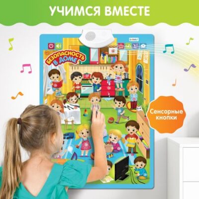 Обучающий плакат «Безопасность в доме». Обучающий плакат «Безопасность дома» поможет объяснить малышу технику безопасности. Игрушка развивает зрительное, слуховое восприятие, логическое мышление и память. <b> Плакат воспроизводит:</b> <ul> <li> правила,</li> <li> советы,</li> <li> веселую песенку.</li> </ul> Яркий плакат поможет вовлечь ребенка в учебный процесс. Для закрепления полученных знаний есть интересные вопросы, на которые малышу предстоит ответить.