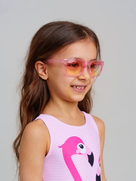 Очки в оправе с глитером. Солнцезащитные очки с фильтром Cat3 детские для девочки. Ширина оправы — 126мм, длина дужки — 125мм. Обхват головы 50-52см. Темные фильтры блокируют 85% солнечных лучей такие очки эффективны для защиты глаз в тропиках, у моря и в горах. Очки транспортируются в картонной коробке. В комплект входит фирменный текстильный чехол из микрофибры, с помощью которого легко ухаживать за изделием.