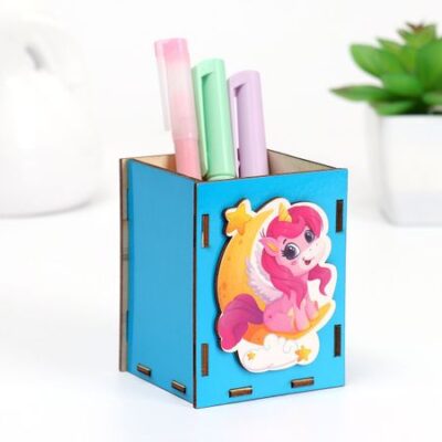 Органайзер для хранения канцелярии «Сказочный единорожка», карандашница. Деревянный органайзер для канцелярии «Сказочный единорожка» — это практичный и стильный аксессуар для рабочего стола. Он не только помогает поддерживать порядок, но и добавляет яркий акцент в интерьер. Подставка подходит для хранения ручек, карандашей и других мелких предметов, делая ее универсальным решением для детей и взрослых. <b> Особенности</b> <ul> <li> Изготовлен из экологически чистого дерева, безопасного для детей от 3 лет.</li> <li> Включает 5 элементов для сборки, что развивает мелкую моторику и логическое мышление.</li> <li> Размер собранной модели компактно размещается на столе.</li> <li> Яркий голубой цвет и милый дизайн с единорогом поднимают настроение.</li> </ul> Этот аксессуар сочетает в себе функциональность и эстетику. Сборная конструкция делает его интересным для детей, а натуральные материалы и качественная обработка обеспечивают долговечность. Органайзер с пандой станет отличным подарком для любителей милых деталей и тех, кто ценит порядок на рабочем столе.