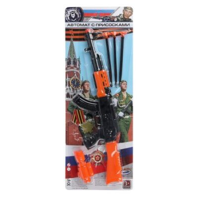 Оружие с присосками или шарами ИГРАЕМ ВМЕСТЕ B1807397-R. Игровой автомат «АК-47» ТМ «Играем вместе» станет отличным подарком для юного героя:<br> — реалистичный дизайн<br> — удобно держать в руках<br> — автомат стреляет пулями на присосках<br> <br> В комплекте:<br> — автомат<br> — 3 пули на присосках<br> — прицел<br> — медаль<br> <br> С таким набором ребенок сможет придумать и разыграть множество увлекательных сюжетов. При этом он также потренирует свою меткость, стреляя из оружия пулями на присосках. Набор подойдет для активных игр на воздухе и в помещении.<br> <br> Игра с набором ТМ «Играем вместе» развивает:<br> — воображение<br> — внимание<br> — моторику<br> — координацию движений<br> <br> Размер автомата: 40 х 15 х 2 см. Размер упаковки: 50,7 х 19 х 2 см.<br> Материал: пластмасса.<br> Рекомендовано детям от 3-х лет.