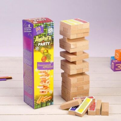 Настольная игра развивает координацию движений, ловкость и мелкую моторику, а также формирует пространственное и архитектурное мышление.Правила игрыПостройте башню из брусков: каждый ряд сооружается из трёх элементов вплотную друг к другу.Каждый новый ряд должен располагаться поперёк предыдущего.Поочередно вытягивайте бруски из разных частей башни так, чтобы она не упала.Вытянутые бруски можно убрать в сторону.Когда башня рухнет, игра заканчивается. Проигравшим считается тот, в чей ход произошёл обвал башни.