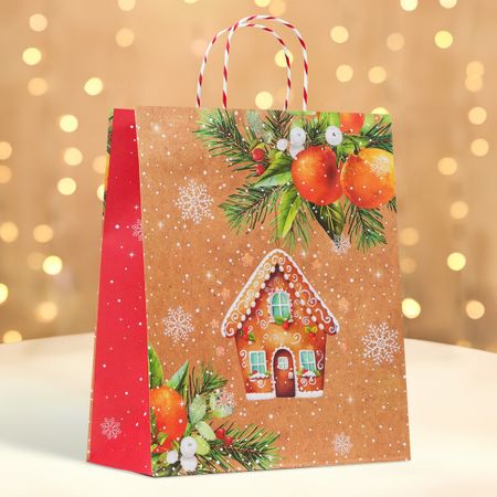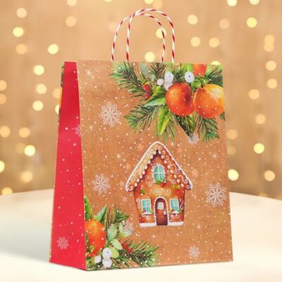Пакет бумажный подарочный новогодний крафт «Пряничный домик» 26×32×12 см. <strong> Пакет новогодний подарочный</strong> — это яркий и красочный аксессуар, который поможет создать праздничное настроение и сделать подарок еще более запоминающимся. Пакет выполнен из качественных материалов, которые обеспечивают его прочность и долговечность. Он имеет яркий дизайн с новогодними мотивами, такими как снежинки, елки, Дед Мороз и другие символы Нового года. Пакет имеет удобную форму и размер, что позволяет легко поместить в него подарки различных размеров. Он также оснащен удобными ручками для переноски. Новогодний подарочный пакет — это отличный выбор для тех, кто хочет порадовать своих близких и друзей в этот волшебный праздник. Он добавит нотку радости и веселья в любой подарок!