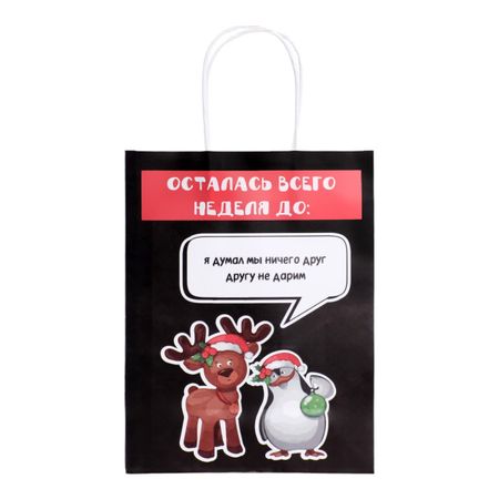 Пакет бумажный подарочный новогодний крафт, «Я думал мы ничего не дарим», 27×21×11 см. <strong> Крафтовый пакет с новогодним приколом</strong> — это идеальный выбор для тех, кто хочет добавить нотку юмора и оригинальности в праздничную упаковку подарков. <ul> <li> Размером 27 х 21 х 11 см, этот пакет достаточно вместителен для разнообразных подарков, от небольших сувениров до более крупных презентов.</li> <li> Изготовленный из прочной крафт-бумаги, он не только экологически безопасен, но и способен выдержать вес содержимого.</li> <li> Дизайн пакета украшен забавной новогодней иллюстрацией или остроумной надписью, которая непременно вызовет улыбку у получателя.</li> <li> Такой пакет идеально подходит для тех, кто хочет внести немного веселья и легкости в атмосферу праздника, делая процесс дарения еще более радостным и запоминающимся.</li> </ul>