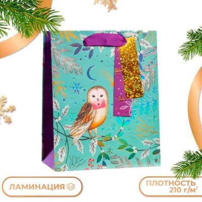 Пакет подарочный «Зимняя совушка», люкс 18×22.3×10 см. Стильный новогодний пакет с ламинацией используют как упаковку для подарка. Благодаря своему оригинальному дизайну и привлекательному внешнему виду он создаст праздничное настроение получателю и не оставит его равнодушным. Пакет практически не подвергается влиянию влаги, способен выдерживать в несколько раз больший вес, чем пакеты без ламинации.