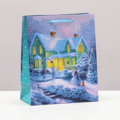 Пакет подарочный "Новогодний дом в лесу", 18 х 22,3 х 10 см.. Новогодний подарочный пакет с ярким, красочным рисунком создаст праздничное настроение. <br> Упаковка защитит подарок при его транспортировке и сохранит интригу до самого момента вручения. <br> Пакет прямоугольной формы изготовлен из ламинированной бумаги. <br> Для удобства переноски предусмотрены две ручки. <br> Универсальный, прочный и яркий пакет для упаковки любых товаров. <br> <br> <br>