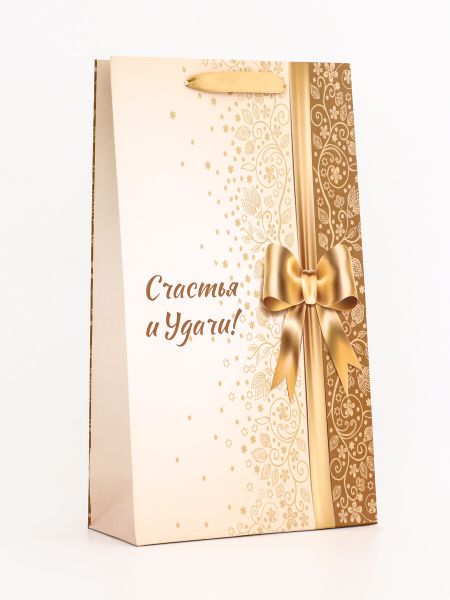Пакет подарочный под две бутылки «Счастья и удачи!», 35×20×9 см. <strong> Пакет подарочный ламинированный, плотность 190 г/м²</strong> Этот пакет представляет собой идеальную комбинацию стиля, качества и функциональности. Ламинирование придает поверхности гладкость и блеск, благодаря чему упаковка выглядит особенно эффектно и презентабельно. Плотность 190 г/м² обеспечивает исключительную прочность и надежность, что позволяет использовать пакет для самых разнообразных подарков, включая тяжелые предметы. Ламинированная поверхность отлично сохраняет краски, поэтому изображение остается ярким и четким долгое время. Кроме того, такая упаковка устойчива к воздействию влаги и грязи, что делает ее идеальной для использования в любых условиях. Пакет легко складывается и занимает минимум места, что очень удобно при хранении. Благодаря прочному материалу, он выдерживает многократное использование, что делает его экономичным вариантом для частых дарителей. Этот пакет станет отличным выбором для тех, кто ценит качество, стиль и внимание к деталям. Независимо от повода, будь то день рождения, свадьба, Новый год или любой другой праздник, ваш подарок в таком пакете обязательно произведет впечатление и оставит приятные воспоминания.