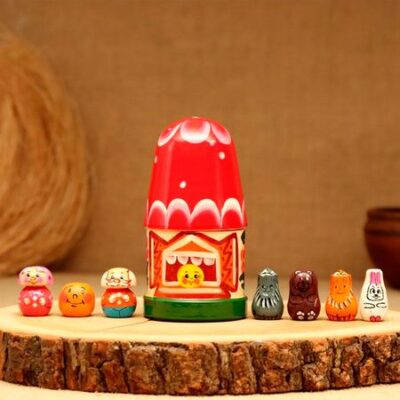 Куклы-матрёшки представляют собой героев русских народных сказок. Игрушка научит отличать большое от малого, строить фигуры в ряд по величине: от меньшего к большему, поможет малышу запомнить героев сказки и научиться разыгрывать её.ОсобенностиЗнакомство с героями сказок, проигрывание сюжета с помощью кукол-матрёшек совершенствуют восприятие, память, воображение ребёнка, развивается речь и мелкая моторика (учите ребёнка раскрывать матрёшку вращательными движениями, а к трём годам — совмещать рисунок на двух частях).Игрушки выполнены из липы, поверх яркого рисунка нанесён лак.Каждая кукла внутри полая, чтобы можно было надеть каждого героя на пальчик, как в настоящем кукольном театре. Внутри игрушки отшлифованы, поэтому безопасны.Как игратьПознакомьте вашего малыша с русской народной игрушкой. Объясните малышу, что такое матрёшка, чем она отличается от других кукол, чем она привлекательна.Выделяйте разных героев интонационно. Поиграйте с малышом в «прятки»: попросите его угадать, кто находится внутри дедушки, сколько фигурок помещается в большой (средней и так далее) матрешках. С каждым разом привлекайте ребёнка ко всё большей активности, пусть он сам раскладывает героев по росту, проговаривает фрагменты текста сказки.С помощью матрешки можно изучать простейшие математические понятия «больше», «меньше», «величина», построение ряда по величине, порядковый и количественный счёт.