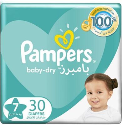 Introducing the perfect solution for your little ones nighttime comfort — Pampers Baby-Dry Diapers in Size 7, Extra Large+. Designed to provide up to 12 hours of dryness, these diapers are perfect for babies weighing 15+ kg. The unique three-layer design of Pampers Size 7 locks away wetness and keeps your babys skin dry and comfortable all night long. The soft and stretchy sides provide a snug fit that moves with your baby, ensuring maximum comfort and protection. The extra absorbent channels distribute wetness evenly, preventing leaks and keeping your babys skin healthy. With 30 diapers in each pack, you can be sure that youll have enough to keep your little one dry and happy. Invest in Pampers Size 7 Baby-Dry Diapers for a peaceful and comfortable nights sleep for both you and your baby.