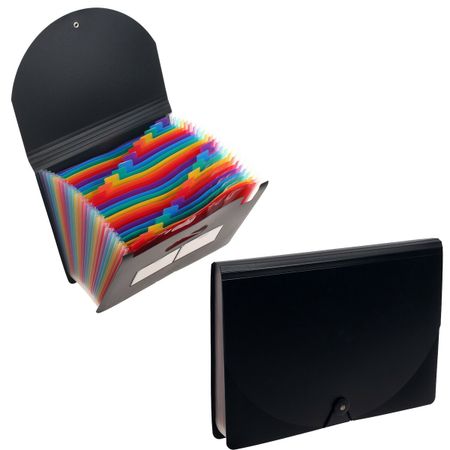 Папка на резинке А4, 24 отделения (разноцветные), черная. Папка на резинках Calligrata предназначена для защиты документов от повреждений. Такие папки широко применяются не только в офисах, деловой жизни, но и в быту для хранения личной документации, учебных материалов. <ul> <li> Папка на резинках формата А4 изготовлена из экологически чистого полипропилена с песчаной фактурой плотностью 500 мкм.</li> <li> Клапаны надежно удерживают документы внутри, не позволяя им выпасть и потеряться, а резинки, расположенные на углах, плотно закрывают папку. Резинки являются надежными фиксирующими элементами. Их прочность позволяет сохранять качество после огромного количества растяжений.Эти фиксаторы позволяют за несколько секунд достать и уложить нужный документ.</li> <li> Папка способна вмещать до 300 листов стандартной плотности, что делает ее универсальной как для транспортировки, так и для долгосрочного хранения документов.</li> </ul>