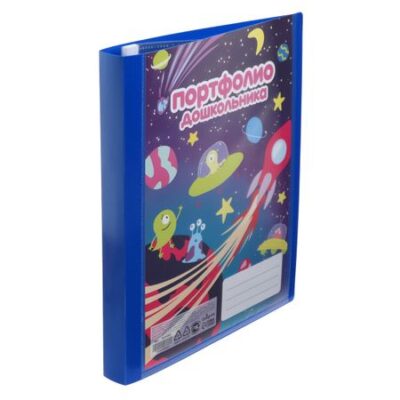 Папка-портфолио А4, Calligrata "Космические друзья", пластиковая, на 2 кольцах, для дошкольника, 10 файлов. Папка-портфолио для школьника изготовлена из пластика. <b> Особенности:</b> <ul> <li> Портфолио имеет кольцевое крепление, с помощью которого крепятся 10 файлов. в нем можно хранить всевозможные грамоты, дипломы, фотографии и другие достижения школьника; при желании можно дополнить.</li> <li> Вкладыши покупаются отдельно или можно дома совместно с ребенком сделать своими руками.</li> </ul> <b> Характеристики:</b> <ul> <li> Размер: 245 х 320 мм;</li> <li> Формат: А4.</li> <li> Назначение: универсальное для детского сада;</li> <li> Наличие файлов: 10;</li> <li> Количество вкладышей: нет;</li> <li> Материал папки: пластик;</li> <li> Материал файла: полипропилен;</li> <li> Плотность файла: 30 мкм;</li> <li> Крепление на кольцах: да;</li> <li> Цвет: классический синий.</li> </ul>