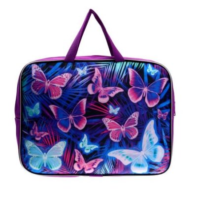 Папка с ручками текстильная «Бабочки» А4, 350×270×70 мм. Папка текстильная на молнии с ручками, формат A4+. Размер 270 х 70 х 350 мм. Материал: износо-морозостойкий водоотталкивающий 100% полиэстер. Предназначена для транспортировки учебных принадлежностей, документов и различных аксессуаров. Имеет одно большое отделение с расширением и карманом внутри, застежка на молнии с мягким ходом. Для комфортной переноски ручки папки выполнены из прочной стропы