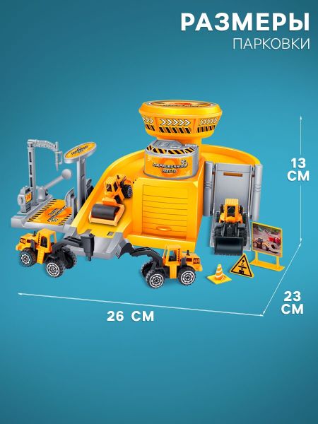 Парковка «Стройплощадка», с 2 металлическими машинами. <b> Движение в ритме города!</b> Юный автолюбитель по достоинству оценит двухуровневую парковку с лифтом. Такая игрушка займет важное место в коллекции игрушек малыша. Машинки можно припарковать в гараже, в комплекте есть дорожные знаки и указатели. Благодаря им игра с машинками станет еще увлекательнее и разнообразнее. Также она поможет ребенку освоить основные правила дорожного движения. Детали игрушки выполнены из безопасного пластика и легко собираются — малыш без труда сможет возвести собственный город машин. Собирая двухуровневую парковку с лифтом, кроха разовьет логическое и образное мышление, мелкую моторику, фантазию и воображение. Товар предназначен для детей от 3 лет.