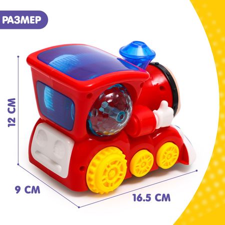 Паровоз «Диско», диско-шар, световые и звуковые эффекты, работает от батареек, цвет красный. Малышу обязательно понравится такой подарок! Транспорт на батарейках с диско-шаром с легкостью объезжает встречающиеся препятствия и светится разными цветами. <b> Особенности</b> <ul> <li> Встроен самоходный механизм. После включения транспорт едет вперед.</li> <li> Во время игры светится диско-шар и играет веселая музыка.</li> <li> Для работы потребуется 3 батарейки типа АА (нет в комплекте).</li> <li> Товар предназначен для детей старше 3 лет.</li> </ul> <b> Увлекательно и полезно!</b> Игра с машинкой разовьет воображение ребенка, цветовое и эмоциональное восприятие, улучшит координацию движений и мелкую моторику.