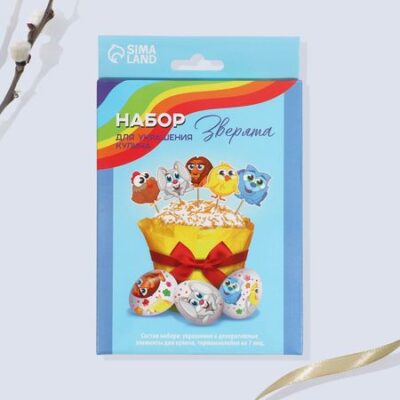 Пасхальный декор для кулича «Зверята» на пасху, 18.5×16×1 см. Пасха — светлый праздник. По традиции все украшают варенные яица, пекут куличи, ходят друг к другу в гости и обмениваются подарками. Можно подарить маме или сделать подарок бабушке, а готовые украшенные куличи вручить родным и друзьям. Исключительно безопасные ингредиенты, которые тщательно отбираются, обеспечивают аппетитный внешний вид продукции. Данный набор — это Ваш инструмент для создания кулинарных шедевров и реализации творческого потенциала. <b> В Пасхальный набор входит:</b> — термонаклейки на 7 яиц; — топперы для кулича — 5 шт; — тишью для кулича — 1 шт; — лента для кулича — 1 шт.