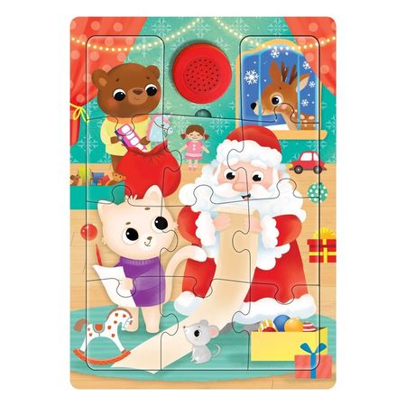 Соберите музыкальный пазл «Дедушка Мороз готовит подарки» и вместе с малышом украсьте новогоднее деревце. Встроенный музыкальный чип сделает игру веселее и интереснее.Особенности пазлаСделан из прочного и экологичного материала — дерева.Пазл двухслойный, состоит из 11 деревянных деталей и поля для сборки со встроенным музыкальным чипом. Все детали вынимаются.Размер пазла: 28 × 20 см.Для проигрывания песенки нажмите на кнопку. Одна песенка играет около 25 секунд.Музыкальный чип работает от 3 батареек LR41 (батарейки входят в комплект). Исходные батарейки носят демонстрационный характер, при необходимости их следует заменить на новые.Слова песенки легко запоминаются:Что такое Новый год? Это радость от хлопот.Ёлки и хлопушки, яркие игрушки.За окошком снег идёт, приходи к нам, Новый год!В упаковках ярких приноси подарки.Чем полезны занятия с музыкальным пазломИгра с красочными картинками способствует развитию цветового, зрительного и логического мышления. А вместе с запоминающейся мелодией ребёнок гораздо быстрее усваивает информацию, развивая при этом музыкальное восприятие. Вовлекайте малыша в творческую деятельность с самого раннего возраста!