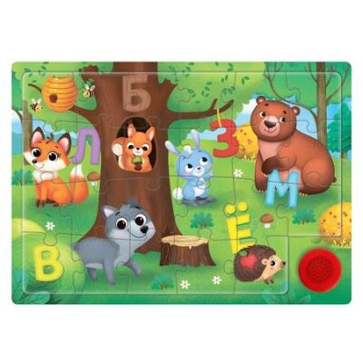 С музыкальным пазлом «Изучаем буквы» малыш узнает, на какую букву начинаются названия лесных жителей. Встроенный музыкальный чип сделает игру веселее и интереснее.Особенности музыкального пазлаСделан из прочного и экологичного материала — дерева.Пазл двуслойный, состоит из 23 деревянных деталей и поля для сборки со встроенным музыкальным чипом. Все детали вынимаются.Размер пазла в собранном виде: 28 × 20 см.Музыкальный чип работает от 3 батареек LR41 (входят в комплект). Исходные батарейки носят демонстрационный характер, при необходимости их следует заменить на новые.Для проигрывания песенки нажмите на кнопку. Одна песенка играет около 25 секунд.Слова песенки легко запоминаются:Волшебством наполнен лес, много здесь чудес.Травка, как подушка, укрыла всю опушку.Хорошо у нас в лесу, встретим волка и лису.Белку, дятла, медвежонка и пушистого зайчонка!Чем полезны занятия с музыкальным пазломСобирая пазл, малыш потренирует мелкую моторику, сообразительность, пространственное и логическое мышление. Запоминающиеся песенки помогут быстрее усвоить новую информацию и развить слуховое восприятие, а красочные изображения — потренировать зрительное восприятие и внимательность.