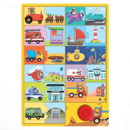 Соберите «Парные пазлы. Транспорт» вместе с малышом и расскажите ему, какая техника и в какой сфере применяется человеком. Встроенный музыкальный чип сделает игру веселее и интереснее.Особенности музыкального пазлаCделан из прочного и экологичного материала — дерева.Пазл двухслойный, состоит из 22 деревянных деталей и поля для сборки со встроенным музыкальным чипом. Все детали вынимаются.Размер пазла: 28 × 20 см.Для проигрывания песенки нажмите на кнопку. Одна песенка играет около 25 секунд.Музыкальный чип работает от 3 батареек LR41 (батарейки входят в комплект). Исходные батарейки имеют демонстрационный характер, при необходимости их следует заменить на новые.Слова песенки легко запоминаются:«Бип! Бип! Бип!» —Гудят машины. Рельсы поезд вдаль умчат.Вдаль летают самолёты, в небесах они парят.«Бип! Бип! Бип!» —Вперёд мы едем, вот на рельсах поворот.Едем, едем, к важной цели нас дорога приведёт.Чем полезны занятия с музыкальным пазломС помощью музыки гораздо лучше усваиваются примеры и развивается музыкальное восприятие, а красочные картинки способствуют развитию цветового, зрительного и логического мышления. Привлечение ребёнка в творческую деятельность с самого раннего возраста — это занимательно и просто!