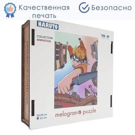 Деревянные пазлы для взрослых и детей Melоgrano puzzle (Мелограно пазл) — это прекрасные развивающие игрушки для девочек и мальчиков, а также антистресс и хобби для взрослых. Наруто М из 110 деталей, размер в сборе 20х28,5 см. Средний размер фигурных деталей 2-3 см, и они приятные на ощупь. Из-за особенностей производства, вырезания на лазерном станке, пазл приобретает легкий аромат опалённого дерева. Деревянные пазлы на 100% экологичны и безопасны. Материалы, из которого они изготавливаются: ХДФ (древесноволокнистая плита высокой плотности), бумага, УФ-отверждаемые чернила. Клей в пазлах и коробочке не используется. Коробочка для пазлов собирается вручную, путем установки одной детали в другую. Наши пазлы сертифицированы для детей от 3х лет, но, мы рекомендуем самостоятельную сборку пазлов детям от 7 лет, а до этого возраста предлагаем собирать детям и взрослым вместе, помогая друг другу. Деревянные пазлы для детей развивают память и внимание, мелкую моторику, творческое и логическое мышление, и воображение! Взрослым они помогут перезагрузиться после рабочего дня и подарят хорошее настроение! Пазл из дерева в подарочной коробке — это оригинальный и интересный подарок близким и родным