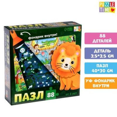 Перед вами не просто пазл, а волшебная игра-головоломка! Необычные элементы привлекают внимание и стимулируют познавательную активность на более высоком уровне, чем классические пазлы.Соберите картинку и отыщите спрятанные на ней секреты. В этом вам поможет ультрафиолетовый фонарик.Как разглядеть спрятанные изображенияВозьмите фонарик и посветите на любое место игрового поля.В луче фонарика вы увидите яркие изображения.Если выключить свет, изображения под лучом фонарика станут ярче.Ребёнка ждут увлекательные задания:Какие таблички перепутали?Кто из животных сбежал из вольера?Кто побывал в каждом вольере?Сколько стрекоз сидит на слоне?Сколько бананов съела обезьяна?Чем девочка кормит жирафа?У какой зебры ненастоящие полоски?Польза собирания пазлов для детей:развивает логическое мышление и кратковременную память;тренирует усидчивость и мелкую моторику рук;учит различать цвета и находить связь между частью и целым.