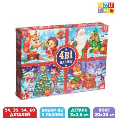 Набор пазлов с новогодними сюжетами «Дарим новогодние подарки» — то, что нужно для полезного и интересного досуга! Такой подарок поможет ребёнку скрасить ожидание Нового года, а также потренировать мелкую моторику, внимательность, логическое мышление и память.Особенности набораВнутри коробки вы найдёте 4 пазла на 24, 35, 54 и 60 деталей.Детали пазлов выполнены из картона.Польза собирания пазлов для детей:Развивает логическое мышление и кратковременную память.Тренирует усидчивость и мелкую моторику рук.Учит различать цвета и находить связь между частью и целым.Как сохранить собранные пазлыНанесите клей для пазлов на лицевую сторону получившейся картинки, равномерно распределите его по поверхности.Клей высыхает в течение 1,5−2 часов. После высыхания клей абсолютно прозрачен и не оставляет разводов.Вставьте получившуюся картинку в раму и украсьте интерьер.Пазлы рекомендованы детям старше 3 лет.