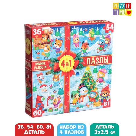 Набор пазлов с новогодними сюжетами «Зимние радости» — то, что нужно для полезного и интересного досуга! Такой подарок поможет ребёнку скрасить ожидание Нового года, а также потренировать мелкую моторику, внимательность, логическое мышление и память.Особенности набораВнутри коробки вы найдёте 4 пазла на 36, 54, 60 и 81 деталей.Детали пазлов выполнены из картона.Польза собирания пазлов для детей:Развивает логическое мышление и кратковременную память.Тренирует усидчивость и мелкую моторику рук.Учит различать цвета и находить связь между частью и целым.Как сохранить собранные пазлыНанесите клей для пазлов на лицевую сторону получившейся картинки, равномерно распределите его по поверхности.Клей высыхает в течение 1,5−2 часов. После высыхания клей абсолютно прозрачен и не оставляет разводов.Вставьте получившуюся картинку в раму и украсьте интерьер.Пазлы рекомендованы детям старше 3 лет.