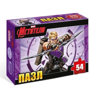 Пазлы «Соколинный глаз» — это яркая и увлекательная игра для маленьких поклонников Мстителей. Составленные из 54 элементов, они переносят ребёнка в волшебный мир, где каждый фрагмент пазла — часть удивительной супергеройской истории.ОсобенностиКартинка с любимым персонажем привлекают внимание и вдохновляют на сборку.Прямоугольная форма собранного пазла удобна для игры за столом или на полу.Картон высокого качества делает детали прочными и безопасными.Подходит для детей от 3 лет, развивая мелкую моторику и логическое мышление.Идеальный выбор для мальчиков, которые любят истории о супергероях и головоломки.Играем с пользойСобирая пазл, ребёнок учится находить связь между фрагментами и целым, тренируя внимание и терпение. Яркие цвета и знакомые персонажи надолго удерживают интерес малыша, а также способствуют развитию зрительного восприятия и воображения. Расскажите ребёнку о приключениях соколинного глаза, чтобы сделать игру ещё увлекательнее.Как сохранить собранный пазлНанесите клей для пазлов на лицевую сторону получившейся картинки, равномерно распределите его по поверхности.Клей высыхает в течение 1,5−2 часов. После высыхания клей абсолютно прозрачен и не оставляет разводов.Вставьте получившуюся картинку в раму и украсьте интерьер.