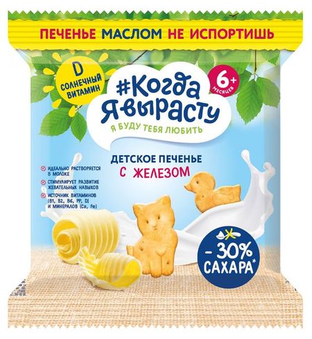 #Когда Я вырасту — первый российский бренд для заботливых мам, которые выбирают для своих малышей полезные и безопасные продукты! Сливочное печенье обогащенное железом — это сбалансированный и полезный детский продукт питания или дополнительного прикорма для детей старше 6 месяцев, в состав печенья входит натуральное сливочное масло, полезные для малыша витамины и минералы, включая жизненно необходимый витамин Д. В отличии от классического печенья бренда # Когда Я вырасту, сливочное печенье содержит на 30% меньше сахара. С печеньем в форме животных малыш легче и быстрее научится их узнавать, а процесс кормления превратиться в забавное и веселое обучение! Печенье производится на новейшем современном заводе с соблюдением высоких требований к качеству детского питания. Печенье можно употреблять в сухом виде или разводить теплым молоком, чаем или водой. Для кормления растворите из расчета 5 штук на 100 мл теплого молока (чая, воды), тщательно перемешайте и кормите из бутылочки или ложечки. Не оставляйте ребенка одного во время еды без присмотра! Особенности: стимулирует развитие жевательных навыков; способствует развитию вкусовых ощущений; обучающие формы — животные; на 30% меньше сахара (в сравнении с классическим видом); не содержит трансжиров; не содержит красителей, консервантов; не содержит ГМО; содержит натуральное молоко; идеально растворяется в молоке; обогащено витаминами (В1, В2, В6, РР, D); обогащено минерами (Са, Fe); произведено в России.