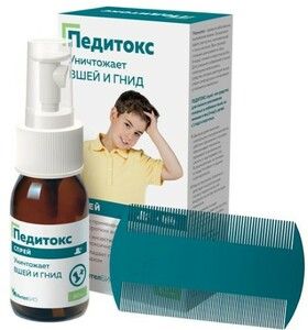 ПЕДИТОКС спрей специально разработан для уничтожения головных и лобковых вшей, их личинок и гнид у взрослых и детей с 1 года.Это современное педикулицидное средство с двойным механизмом действия эффективно на всех стадиях репродукции вшей и не вызывает устойчивость насекомых, эффективно при повторных заражениях.Внешний вид и свойства: прозрачная маслянистная жидкость от бесцветного до светло-желтого цвета, в виде спрея, с приятным запахом (бергамота)ОСОБЕННОСТИ:• Подходит для применения на длинных и коротких волосах• Без инсектицидов, не токсично• Обладает приятным запахомМеханизм действия:• Двойная диметиконовая композиция и натуральные масла в средстве ПЕДИТОКС работают физическим способом: обволакивают насекомое, проникают в дыхательную систему и закупоривают ее. В результате вши, их личинки и гниды погибают от удушья и дегидратации.• Масло бергамота губительно действует на дыхательную систему паразитов за счет входящего в состав терпеноида гераниола. Считается, что механизм его действия обусловлен конкурентным ингибированием фермента ацетилхолинэстеразы, что приводит к смерти насекомого.• Масло жожоба снимает раздражение, вызванное укусами насекомых, зудом и расчесами и способствует заживлению