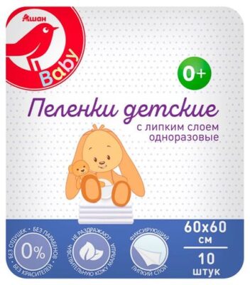 Детские впитывающие пеленки АШАН Красная Птица предназначены для ухода за детьми. Пеленки являются надежной защитой для кроваток, колясок и пеленальных столиков, незаменимы при замене подгузников, массаже и принятии воздушных ванн. Липкий слой надежно удерживает пеленку на месте.